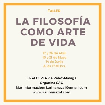 Continuamos con el Taller de filosofía practicada «La Filosofía como Arte de Vida» Dirigido a todo público y gratuito. Próximas Fechas: 12-26 de Abril, 10-31 de Mayo y 14 de Junio. A las 17:30 hrs. En el CEPER de Vélez Málaga. Calle Paseo Nuevo, 18, 29700 Vélez-Málaga, Málaga. Este taller busca acercar a los participantes … More Taller La Filosofía como Arte de Vida