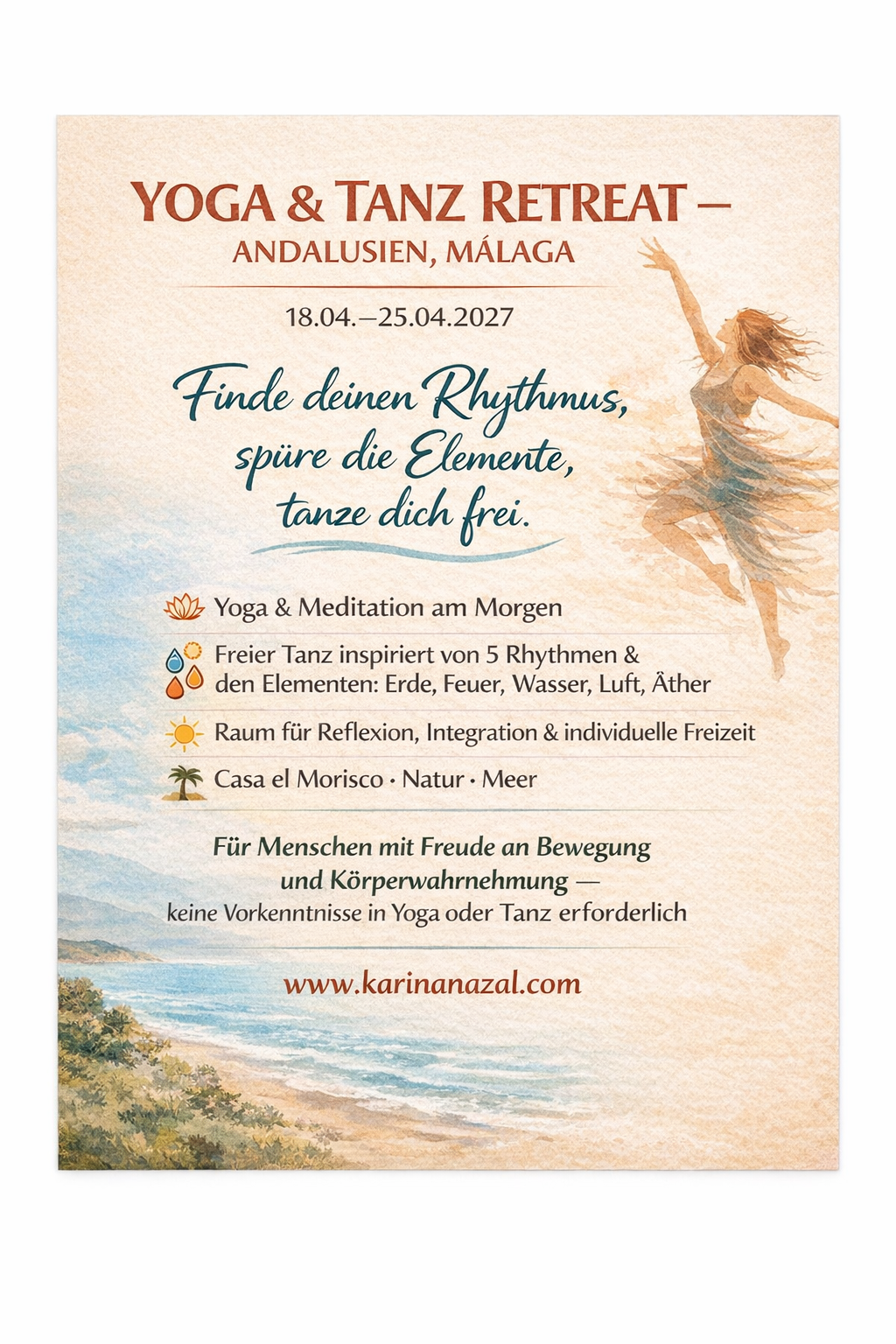 Dieses Yoga & Tanz Retreat ist eine Einladung, den Körper zu hören und Bewegung aus dem eigenen Impuls entstehen zu lassen. Yoga und Meditation am Morgen öffnen den Raum, während der freie Tanz am Nachmittag oder Abend von fünf Rhythmen inspiriert wird, die den Elementen Erde, Feuer, Wasser, Luft und Äther entsprechen. Ohne feste Vorgaben entsteht ein geschützter Raum, in dem Musik, Bewegung und Stille zusammenfließen und authentischer Ausdruck, innere Freiheit und Verbundenheit erfahrbar werden.